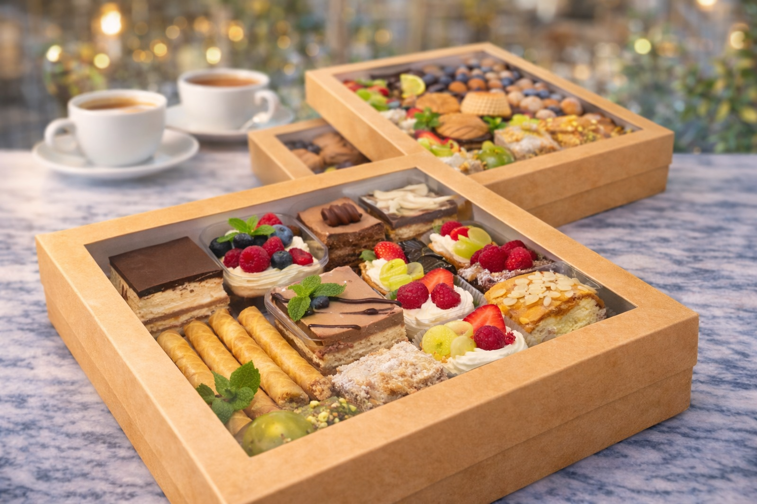 Największa i najbardziej reprezentacyjna wersja zestawu, przygotowana z myślą o większych wydarzeniach. W boxie znajduje się bogaty wybór deserów bankietowych, klasyczne brownie oraz mini serniczki. Różnorodność smaków i estetyczne podanie sprawiają, że zestaw idealnie sprawdza się na eventach firmowych, przyjęciach oraz spotkaniach, gdzie ważne jest wrażenie „premium”.