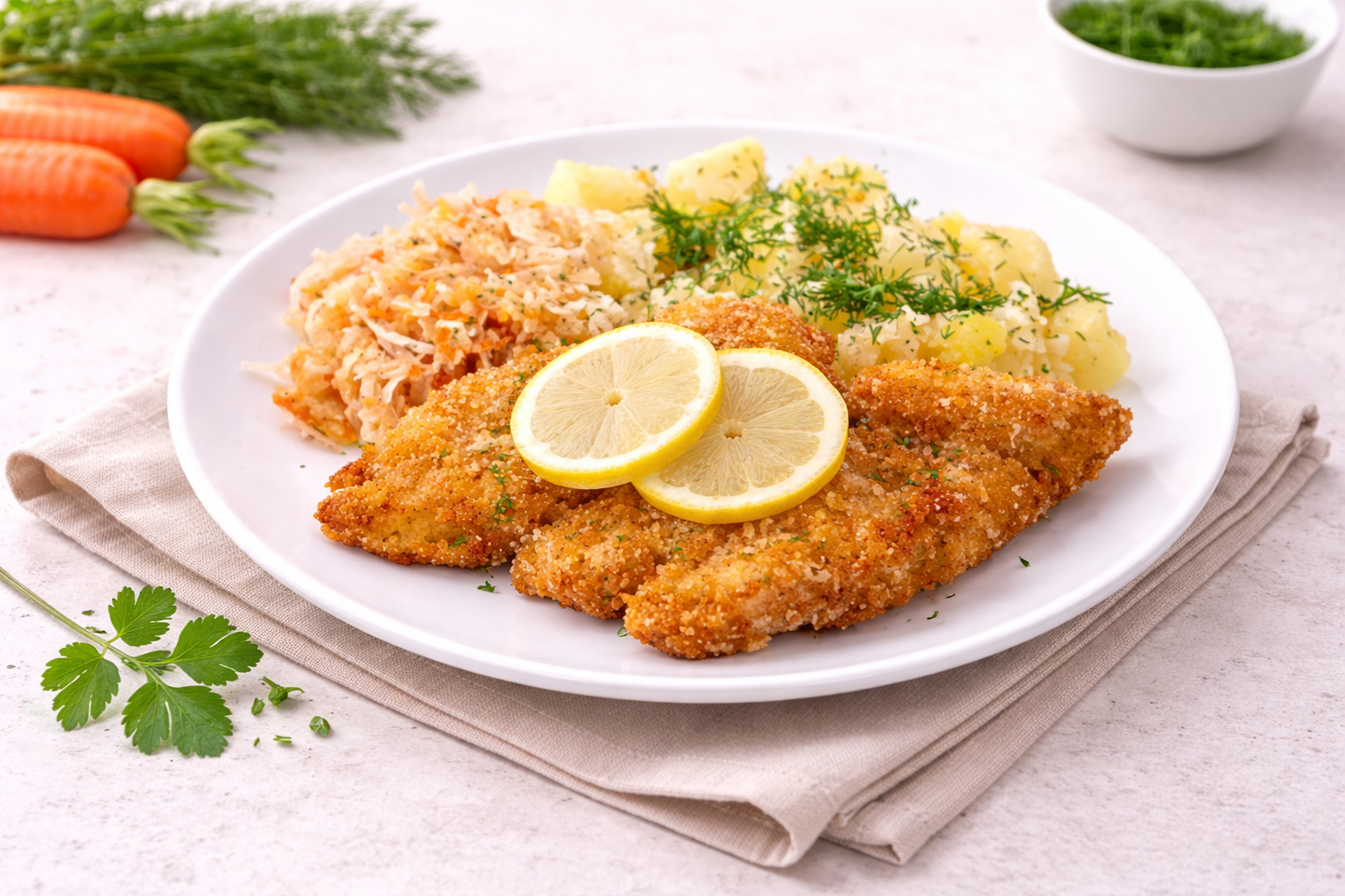 Smażony filet z dorsza w chrupiącej panierce – delikatny w środku, złocisty na zewnątrz. Świeża ryba przygotowana na bieżąco, pełna naturalnego smaku. Idealny wybór na lekki, domowy obiad.