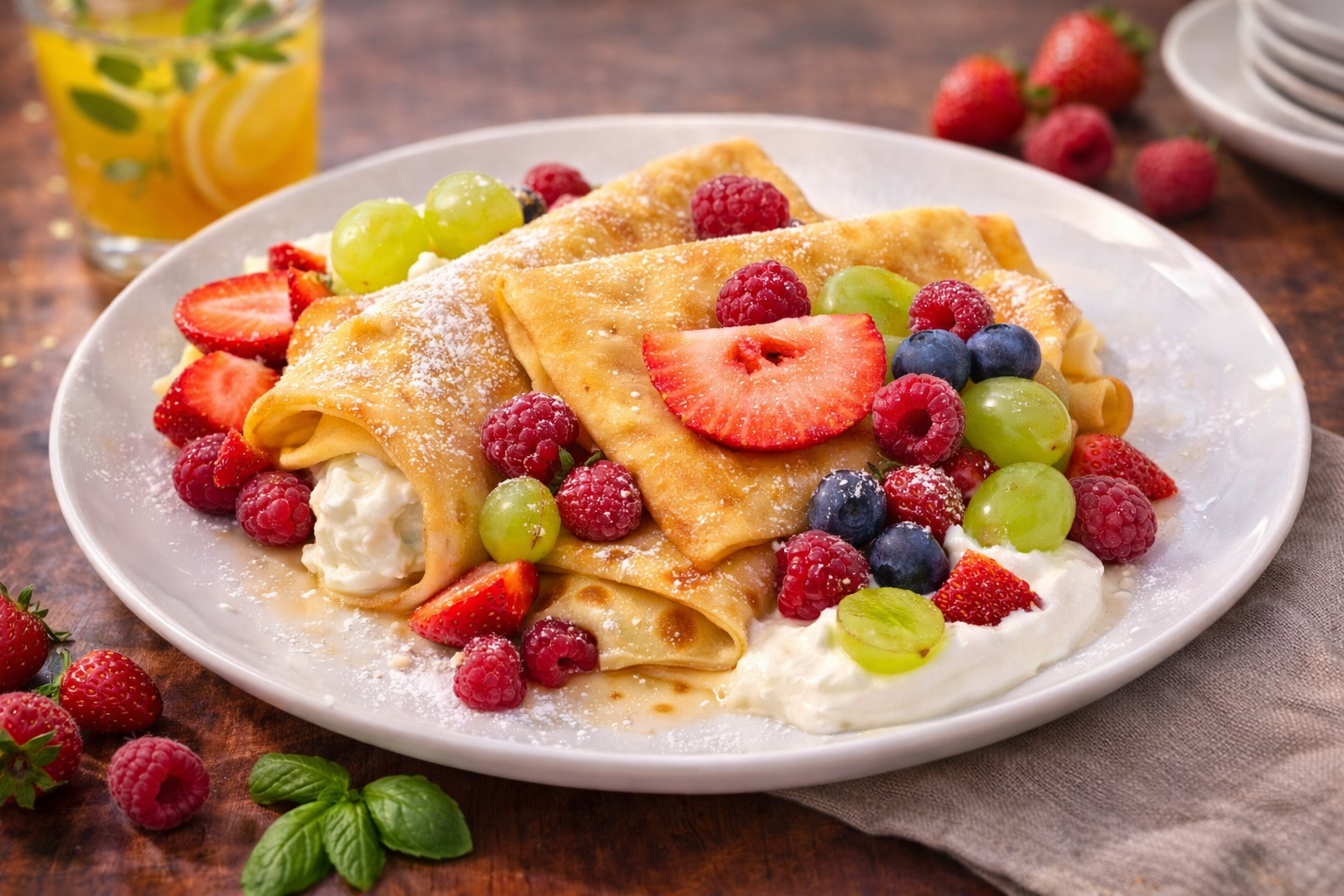 Delikatne naleśniki wypełnione kremowym serem białym, podane z aromatyczną konfiturą i świeżymi owocami. Całość dopełnia lekka, aksamitna śmietana, która nadaje deserowi wyjątkowej harmonii smaku. Domowa klasyka w najlepszym wydaniu – słodka, świeża i niezwykle apetyczna.